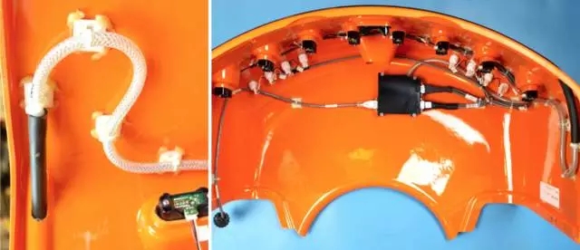 对于像Kiva这种大块的流线型外壳而言,做传统的一体化碰撞传感器是非常困难的。Kiva的工程师们找到了一个非常聪明的低成本解决方案:用乙烯/橡胶管充气,加上一个简单的气压传感器。一旦检测到管内气压变化,机器人就立即停止所有运动。 上图右边的黑盒子用于检测压力信号和所有红外传感器的信号,以简化与主控制器的协议和接线。