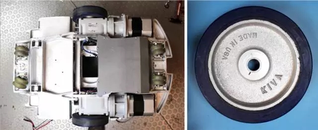 把升降结构拆下来后,我们可以把机器人翻个底朝天来看一看其底盘上的驱动装置。两个电机以及其齿轮箱和升降电机相同,两个定制的轮子组成可以原地旋转的差分结构。