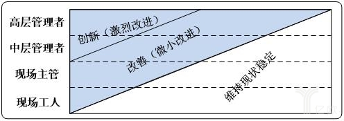 维持系统现状主要由现场工人、现场主管来完成;而改进系统则主要由中高层管理者来完成。创新是剧烈的改进,需要高层管理者进行投资,将新技术、新设备投入到系统中。改善是微小的改进,需要所有人员坚持不懈的努力,使得系统运行的状况越来越好。维持系统的现状稳定,是企业经营管理对企业所有人员的基本要求,每个人都必须尽职尽责。