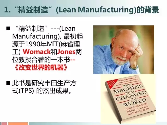 “精益制造”(Lean or Lean Manufacturing)一词的历史其实并不久远,最初起源于1990年MIT(麻省理工)Womack和Jones两位教授合著的一本书--《改变世界的机器》(The Machine That Changed the World)。此书是研究丰田精益生产的杰出之作,强烈推荐。