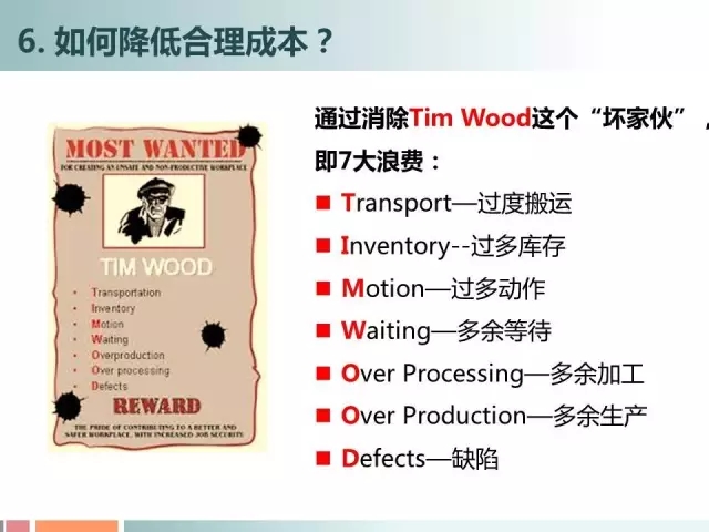 为方便记忆,用 Tim Wood 7个字母代表7大浪费--7 Wastes of Lean,包括: