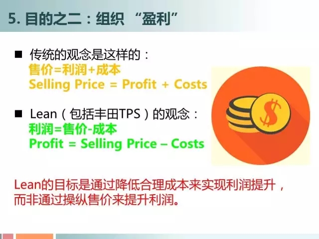 目前的产品和服务定价权已经从慢慢生产者转移到消费者手中,售价是顾客决定的而不是企业,因此利润的多少取决于多大程度上可以降低成本。所以Lean的目标是通过降低成本来实现利润提升,而非通过操纵售价来提升利润。