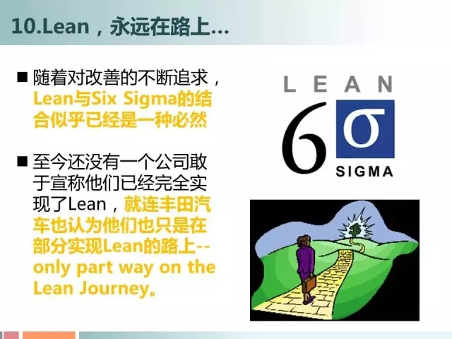 至今还没有一个公司敢于宣称他们已经完全实现了Lean,就连丰田汽车也认为他们也只是在部分实现Lean的路上--only part way on the Lean Journey。