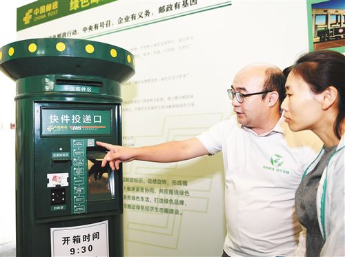 中国邮政近期启动绿色邮政行动,工作人员在讲解邮政智能邮筒。