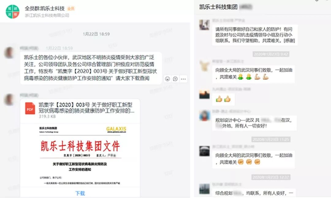 凯乐士科技集团有近300名员工在武汉办公,疫情爆发后,武汉分子公司第一时间做出响应,出台各项措施。随后凯乐士集团在嘉兴、无锡、上海、广州等地的措施也迅速开展,成立疫情防控小组,根据国家标准规范,结合工作实际,制定《关于做好职工新型冠状病毒感染的肺炎健康防护工作安排的通知》、《新型冠状病毒肺炎防控工作指南》、《复工防护指南》等一系列指导手册、流程规范,全方位宣传贯彻;并严格落实员工每日登记健康信息表、健康打卡等措施,做到100%全覆盖,为员工开展工作提供保障,营造健康安全的生产经营环境。