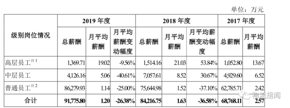 2019年以来的业绩下滑,也成为东航物流员工薪酬下降的因素之一。根据招股书披露,2019年度,公司各层次人员平均薪酬水平为1.2万元,同比下降26.38%,高层人员、中层人员、普通员工月薪降幅分别为9.56%、40.61%、25%。