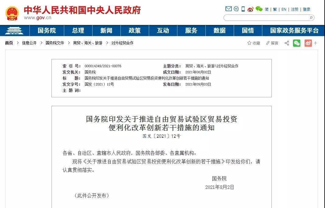 9月3日,据中国政府网获悉,国务院日前印发了关于推进自由贸易试验区贸易投资便利化改革创新若干措施的通知。