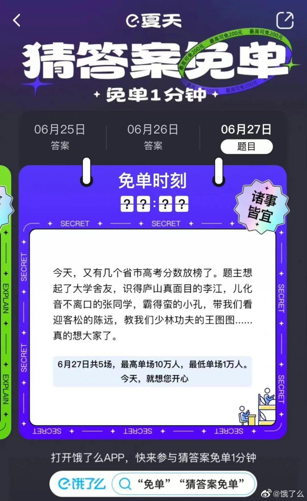 6 月 27 日一早,饿了么 " 免单一分钟 " 就给出了今日免单的新线索:今天,又有几个省市高考分数放榜了,题主想起了大学室友,识得庐山真面目的李江,儿化音不离口的张同学,霸得蛮的小孔,带我们看迎客松的陈远,教我们少林功夫的王图图。真的想大家了!