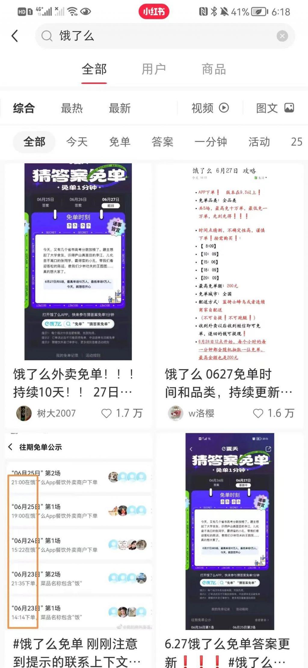 6 月 24 日,饿了么官方微博宣布升级 " 免单 1 分钟 ",即答题免单继续,在此基础上增加了新玩法,每天每小时每 1 分钟都随机抽 1 位免单。