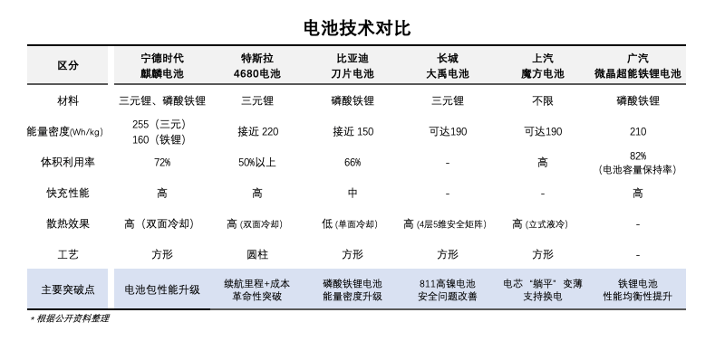 3年前,宁德时代凭借“无模组电池包CTP”问鼎,电池体积利用率首次超过了50%。次年,比亚迪和特斯拉分别推出“刀片电池”、“4680电池”,将体积利用率提升到60%以上,扳回一局。而今6月,宁德时代发布第3代CTP电池“麒麟”,以高出4680电池13%的能量密度又欲问鼎?前日,广汽集团推出“超能铁锂电池技术”,4000次循环下电池容量保持率在80%以上,数据赶超比亚迪“刀片”,不逊于“麒麟”。