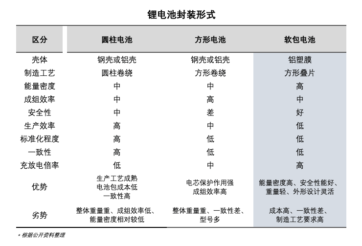 软包电池在能量密度、安全性和制造工艺上,较圆柱、方形电池有显著优势:① 制造工艺采用叠片设计,内部变形、弯曲或断裂的概率低;② 壳体采用不坚硬的铝塑膜,若电池热失控,铝塑膜破裂时可带走大量的热量,避免爆炸;③ 铝塑膜外壳质量较轻,在同等容量下,使得整个电池重量轻20%~40%,能量密度高40%。