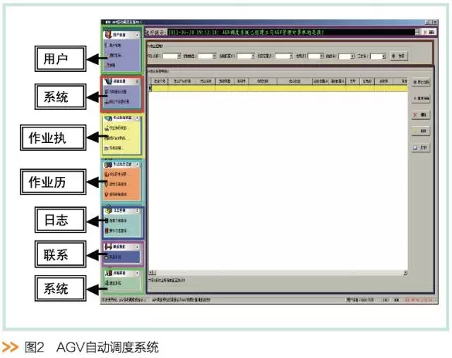AGV自动调度系统(如图2)是连接AGV系统和工厂生产系统MES、仓库管理系统WMS等的接口软件,AGV系统中的调度软件具有当前作业执行状态查询、作业历史记录查询、运行日志查询等功能,进行AGV系统和各相关系统的信息交互和物料信息的自动跟踪。
