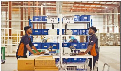 两名工人在阿联酋由中国浙江执御信息技术有限公司打造的跨境购物网站JollyChic的仓库工作。(图片来源:人民日报 王晶晶摄)