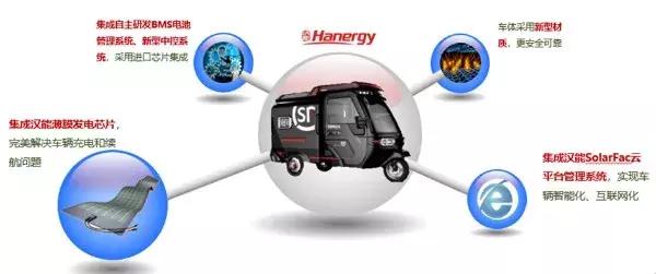 开展物流快递车辆薄膜太阳能发电技术系统性研究和产品研发在国内外尚数首次。为此,国内企业开发了基于薄膜柔性太阳能组件供电的快递车增程技术及系统方案。今年汉能推出的基于薄膜太阳能增程系统的快递三轮车综合了考虑电池的使用情况和寿命,陆续在国内主要物流快递行业领域试点运行,获得了一致好评。整套系统由薄膜太阳能柔性组件、MPPT太阳能充电控制器、接线器等构成,用于不断给快递三轮车的蓄电池充电,实现快递车增加运输里程,同时延长电池使用寿命,增加运营时长,降低运营成本。高效率柔性太阳能组件可直接黏贴或支架形式固定在快递车表面,将太阳能转化为电能并通过充电控制器,储存在铅酸电池中,增加快递车续航里程。