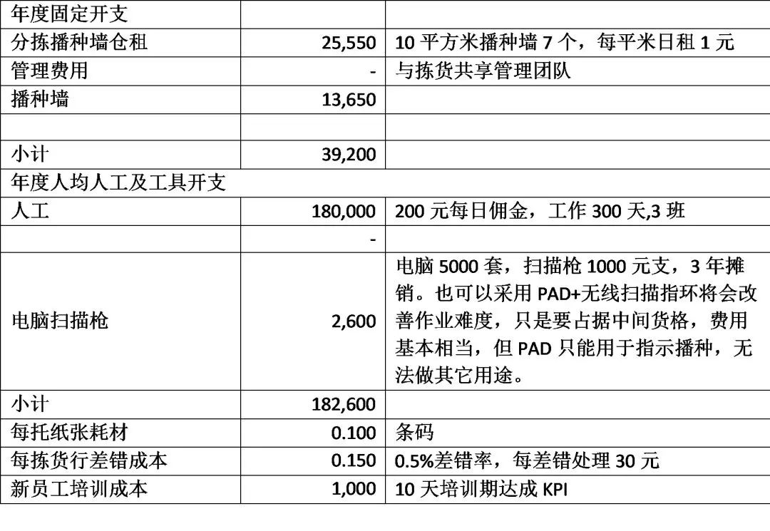 但是播种墙还需要另外花时间集货,但这部分未进行计算,如果以每2个分播工人配1个集货工人,则需要增加约9个工人,年度费用增加162万,费用与分拣工作站相当。