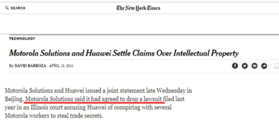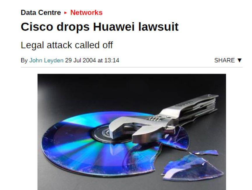 而且,《华尔街日报》提到的那些10多年前的旧案,也是以起诉华为的美国公司自己撤诉而告终的。比如《华尔街日报》用大篇幅提到的2003年华为和美国思科的源代码“抄袭”纠纷,以及10年前摩托罗拉起诉华为“侵犯知识产权”的案子,最后就是思科和摩托罗拉分别在2004年和2011年自行撤诉。