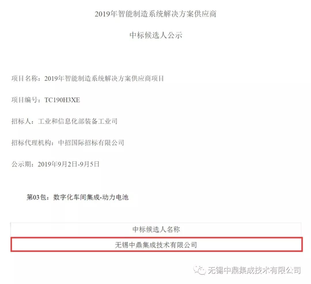 9月5日,国家工业与信息部装备司《2019年智能制造系统解决方案供应商》公示完成,无锡中鼎集成技术有限公司成功入选“数字化车间集成-动力电池”项目包,此批全国共有58家企业入选。