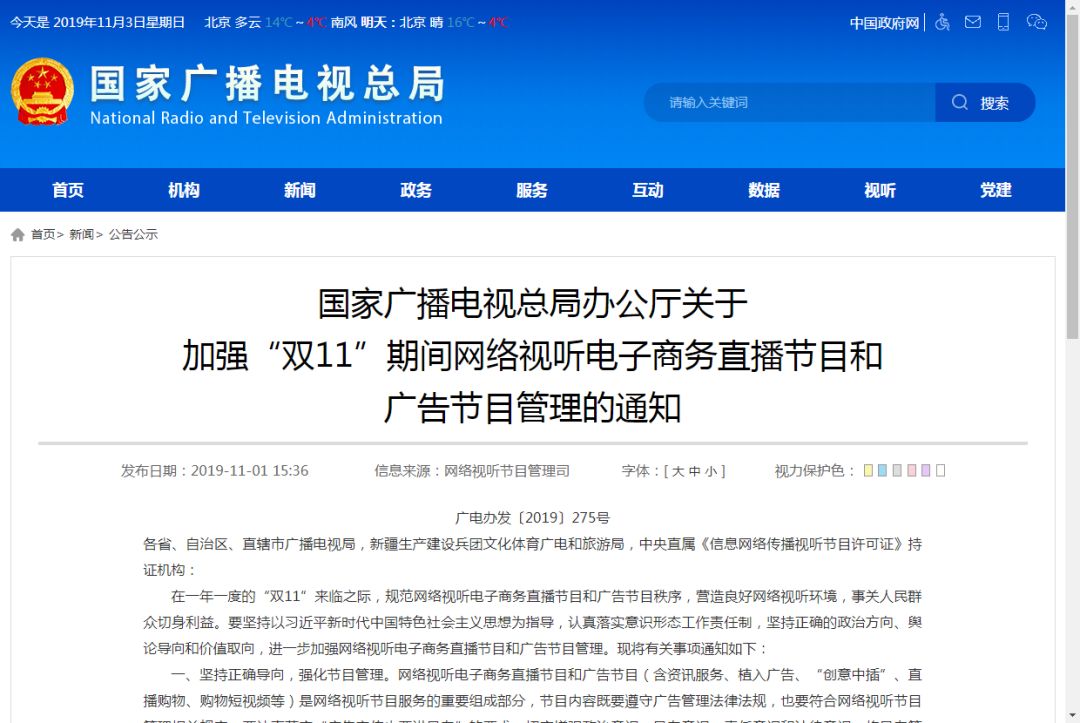11月1日,国家广播电视总局发布《国家广播电视总局办公厅关于加强“双11”期间网络视听电子商务直播节目和广告节目管理的通知》(下简称《通知》)。