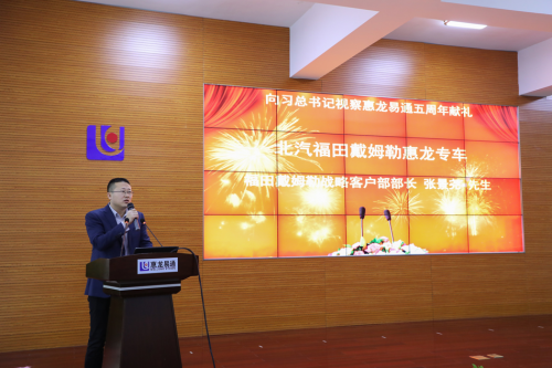 福田戴姆勒战略客户部部长张景尧就“智能驾控,驭见未来”作主题发言,定制惠龙专车、助力惠龙大车队组建。