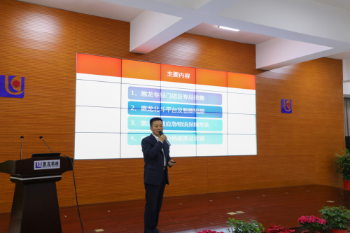 下午会议伊始,惠龙易通副董事长郁培昌就门店、专车、专品、运销拓展及政策作了详细推介。