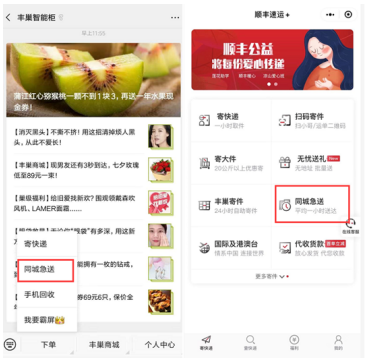 据顺丰同城急送相关负责人介绍,与内部其他业务线加强合作,不仅体现在广告投放层面的曝光,还深入到了服务环节。用户在使用丰巢公众号、顺丰速运公众号下单时,都可以看到“同城急送”的服务选项,这就让我们的用户在接触到任何顺丰旗下服务时,都可以便捷的使用快捷功能选择适合自己的服务类型,而无需逐一登录。