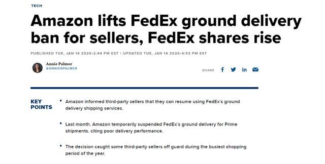 亚马逊官方的发言也很微妙,踢开FedEx的时候,说“基于FedEx糟糕的交付表现,我们决定停止使用FedEx”,而不到一个月后,解除禁令时又说:“联邦快递的地面运输服务一直满足亚马逊准时交货的需求,所以我们恢复使用联邦的快递服务”