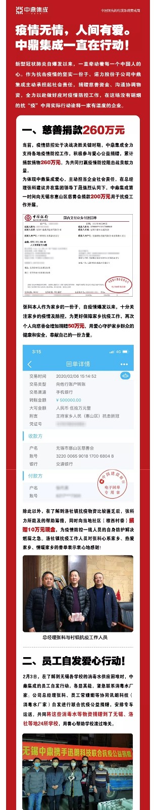 疫情当前,中鼎集成发起爱心公益,捐款捐物260万元全力支援抗疫!