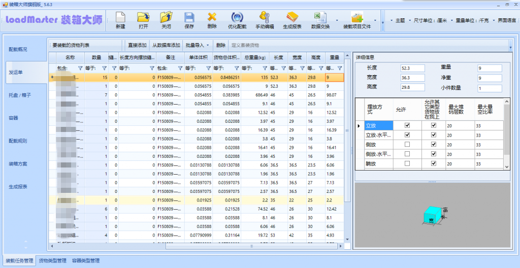 通过实际使用,装柜软件操作简单,界面简洁,能够很快掌握基本操作,首先有定义好的数据导入模板,可以很方便的设定好数据信息。因我们需要先将物料码托,然后再装柜,软件中有两步装载模块,非常适合我们现在的业务。