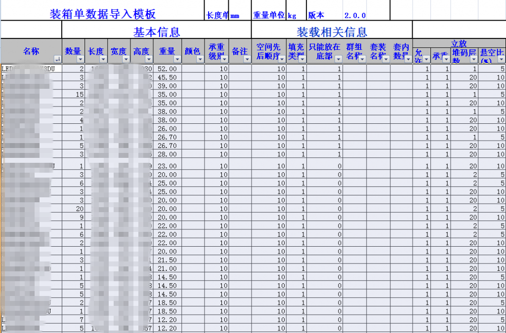 装箱单数据导入模板信息详细,可以设定承重级别、装载顺序,填充类型、码放规则等一系列属性,码托装柜所需要的信息都能体现,满足各方面需求,通过EXCEL文件格式批量导入包装数据。