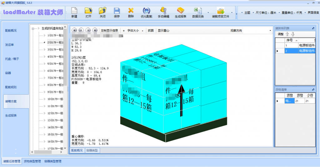 6)码托方案和装柜方案可以以EXCEL表格形式输出,输出的文档文件包括物料清单、包装规格、、分步摆放步骤;