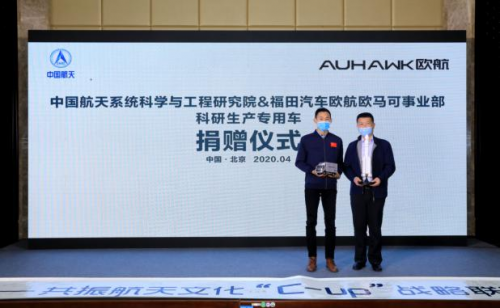 【福田汽车集团副总裁、欧航欧马可事业部总裁顾德华先生与中国航天系统科学与工程研究院科研计划部部长高玉峰先生代表双方完成欧航超级卡车捐赠仪式】