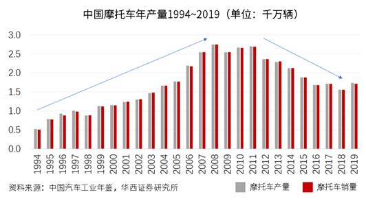 华西证券2020年发布的《摩托车:消费升级新方向》报告显示,受制于各方面因素影响,摩托车市场产销量均处于萎缩状态:一方面, 汽车和电动自行车产销规模快速增长,成为了人们重要的代步出行工具,摩托车消费受到挤压;另外一方面,目前全国共有93个城市出台了摩托车限行政策,摩托车的使用范围遇到诸多不便,压制了摩托车的消费需求。
