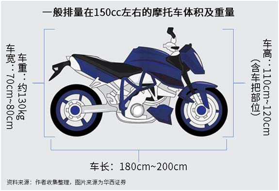 一台排量在150cc的摩托车重量大概在130kg左右,车长在180cm~200cm左右,宽度70cm-80cm左右,高度(车把部位)一般在110cm-120cm左右。虽然摩托车有一定的木架、编织袋等包装保护,但摩托车的大重量、大体积与不规则的外形,使得摩托车在搬运过程中基本都需要叉车进行操作,并小心轻放,防止在搬运过程中出现不必要的磕碰或其他货损发生,对物流公司的操作专业性要求较高。
