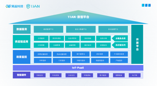 “11AN数智平台”深耕探索冷链及食品安全领域的场景化应用,链接大量生态伙伴的供应链协同应用,关注食品安全行业的监管、追溯和数据分析服务形成智能硬件、场景监控、供应链应用、数据服务的四层产品架构,面向政府和全行业提供食品安全全链条监管和追溯平台。同时通过IoT-PaaS开放平台,“11AN数智平台”可集成食品安全领域的大量IoT设备,对诸多供应链场景实现过程监控,实时采集数据,做到全链条品控和供应链协同,并用数据将食品产业链有效串联,构建食品安全领域的全链条溯源体系。