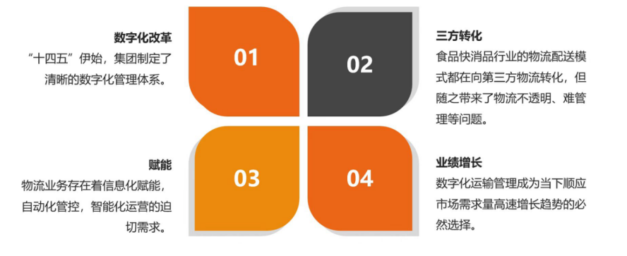 随着今麦郎企业规模的不断扩大、营销售额的快速增长,过去的运输管理体系已无法满足企业发展需要。深化数字化转型,建设运输管理系统,对物流运输进行规范化调整,迫在眉睫。