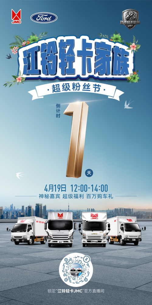 4月19日中午12点,江铃轻卡家族携诸品质好车,在直播间等您,请关注江铃轻卡官方抖音账号“江铃轻卡JMC”锁定直播间,欢庆谷雨喜迎夏季,领取您的专属好礼!