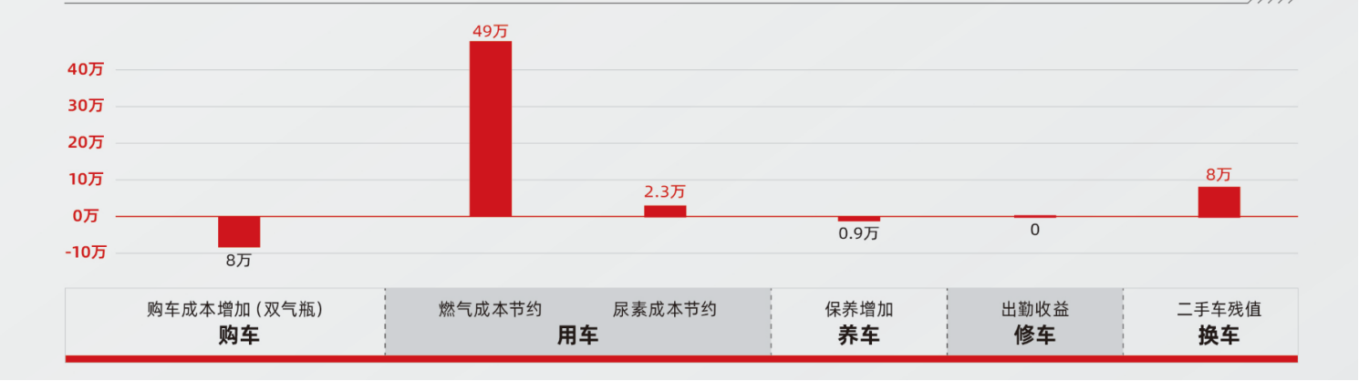 按目前油气价差平均3元计算,每公里燃料成本价差0.65元,以年运营15万公里计算,燃气车在燃料成本上可省近10万元,已完全覆盖油气车购置价差。加上无需尿素,燃气车全生命周期为用户创造价值50万元以上。