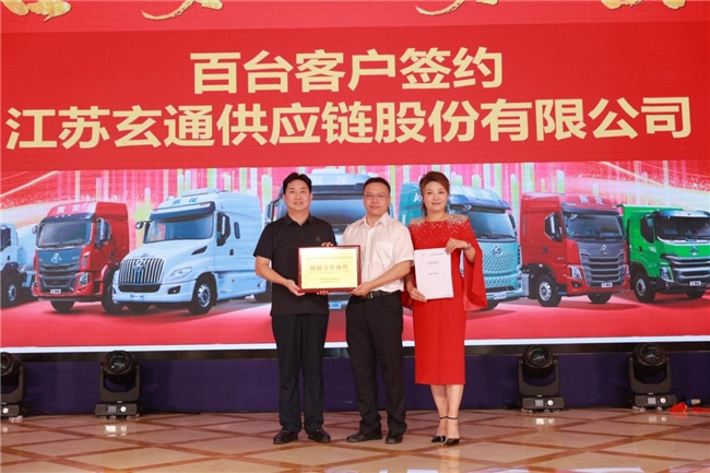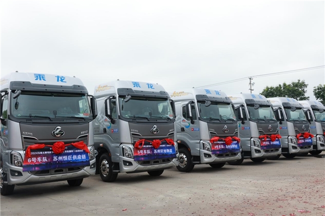 活动现场,搭载玉柴540马力发动机的乘龙H7 LNG新车型亮相,百辆卡车正式签约,充分展现了乘龙卡车在定制化解决方案及技术创新方面的卓越能力。