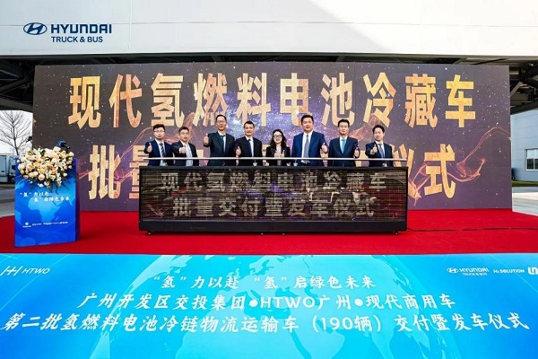 “氢”力以赴,“氢”启绿色未来——2024年12月28日,现代汽车氢燃料电池系统(广州)有限公司(以下简称“HTWO广州”)、现代商用汽车(中国)有限公司向广州开发区交投集团批量交付190台4.5吨现代氢燃料电池冷藏车。此次交付是国内氢燃料电池冷藏车单一批次规模最大的交付行动,也是现代商用车推进氢能落地应用,加速物流运输行业绿色化升级的又一力作。