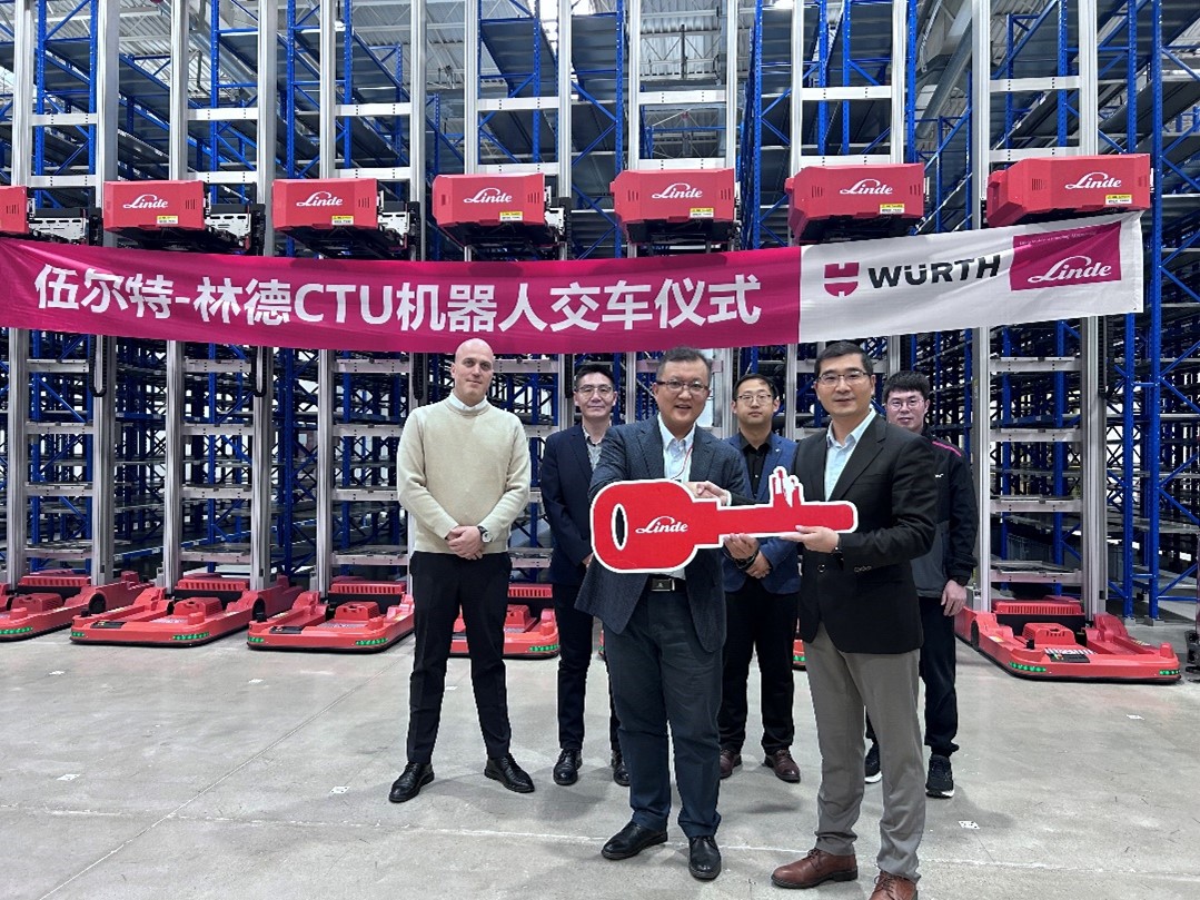 近日,林德自动化为伍尔特量身打造的智能仓储 AGV 自动化解决方案交车仪式在伍尔特天津基地隆重举行。伍尔特物流中心负责人付高翔、林德自动化副总经理高忠崟以及双方项目相关骨干人员共同出席,见证伍尔特仓储物流迈向“自动化+智能化”的关键里程碑。