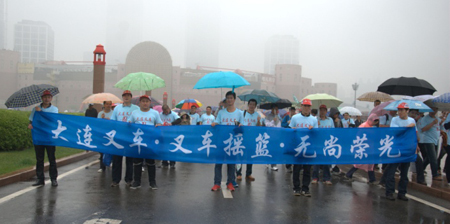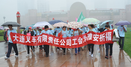 本次徒步大会仍以“健康、和平、交流”为主题,在轻松愉快的徒步过程中,可以收获健康、传递和平,增进交流;可以放松精神,愉悦身心,沟通情感。“大连叉车与世界同行、大连叉车向全市人民问好、大连叉车,叉车摇篮,无尚荣光、大连叉车工会为雅安祈福”的大型条幅以及“大连叉车与您共赢、大连叉车与您同行”的小横幅在细雨中格外醒目,引来众多徒步爱好者和摄影爱好者的目光,四面蓝色的厂旗和15面彩色的支会旗迎风飘扬,展示着大连叉车朝气蓬勃的精神风貌, 大叉队伍似一条长龙,蜿蜒在星海湾徒步大会主会场,队伍中的每个人都昂首挺胸、精神抖擞,无时无刻不展示着作为一名大叉人的那份荣耀和自豪。